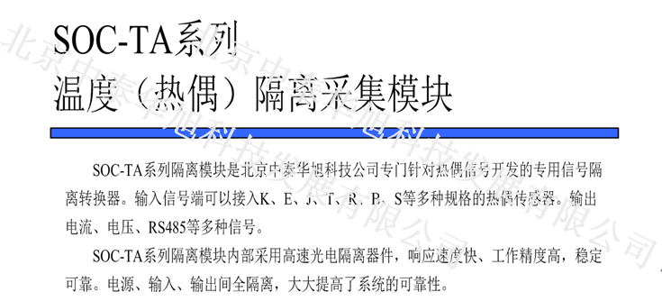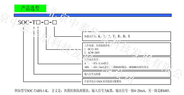 輸入1路:熱電偶溫度信號;輸出2路:1路4-20mA/0-20mA,1路RS485;工作電壓:DC12-36V;型號:SOC-TARS-1-K